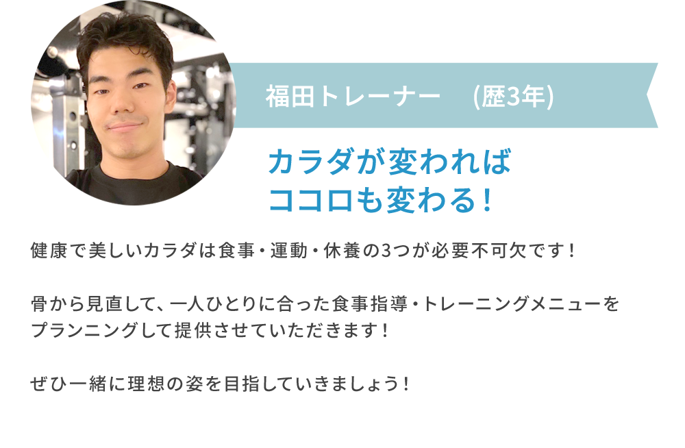 お客様一人ひとりのお身体の状態に合わせて必要なトレーニングをご提案させていただいております。不安なこと、気になることなど何でもご相談ください。