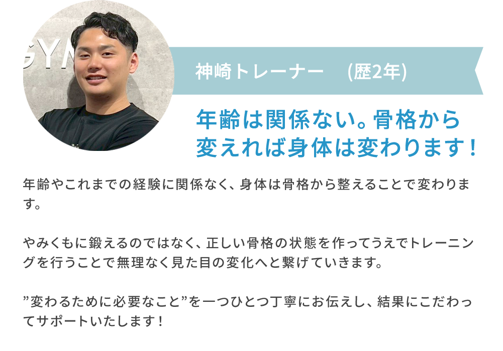 骨格に歪みがあるままトレーニングしても体型は変わりません。 施術で歪んだ骨格を整え、ヨガマット上でツールを使い固定させ、本格的なマシンを使用し正しい位置で定着させます。それを繰り返すことで日常生活でも正しく身体が使えるようになりリバウンドしない身体が作れます。